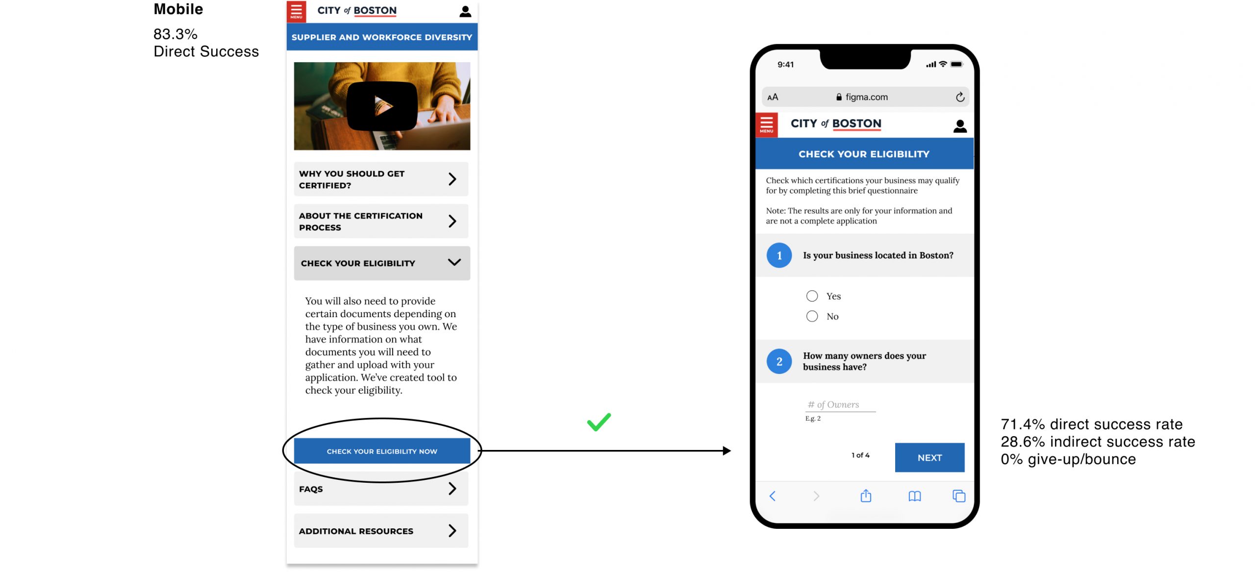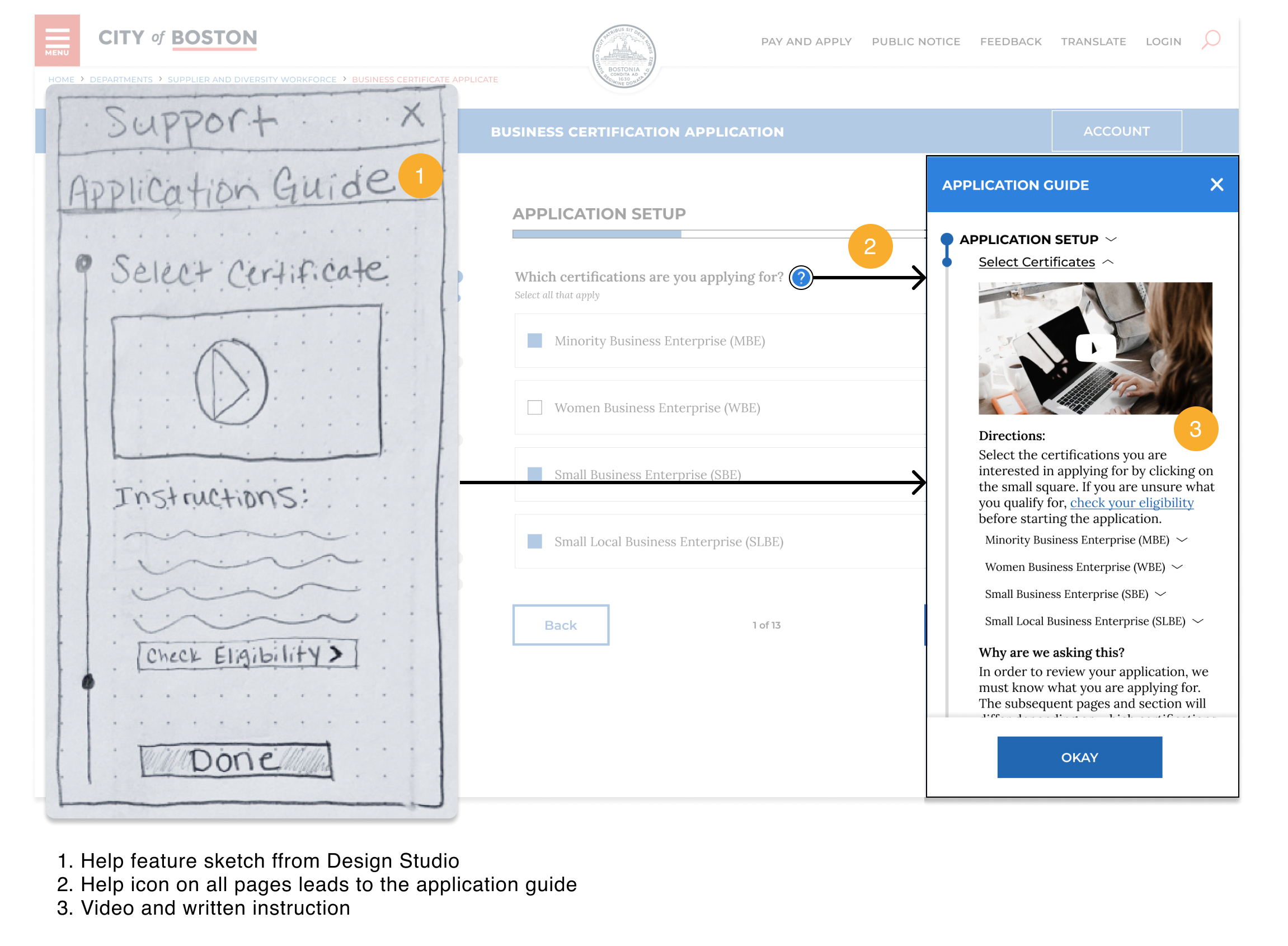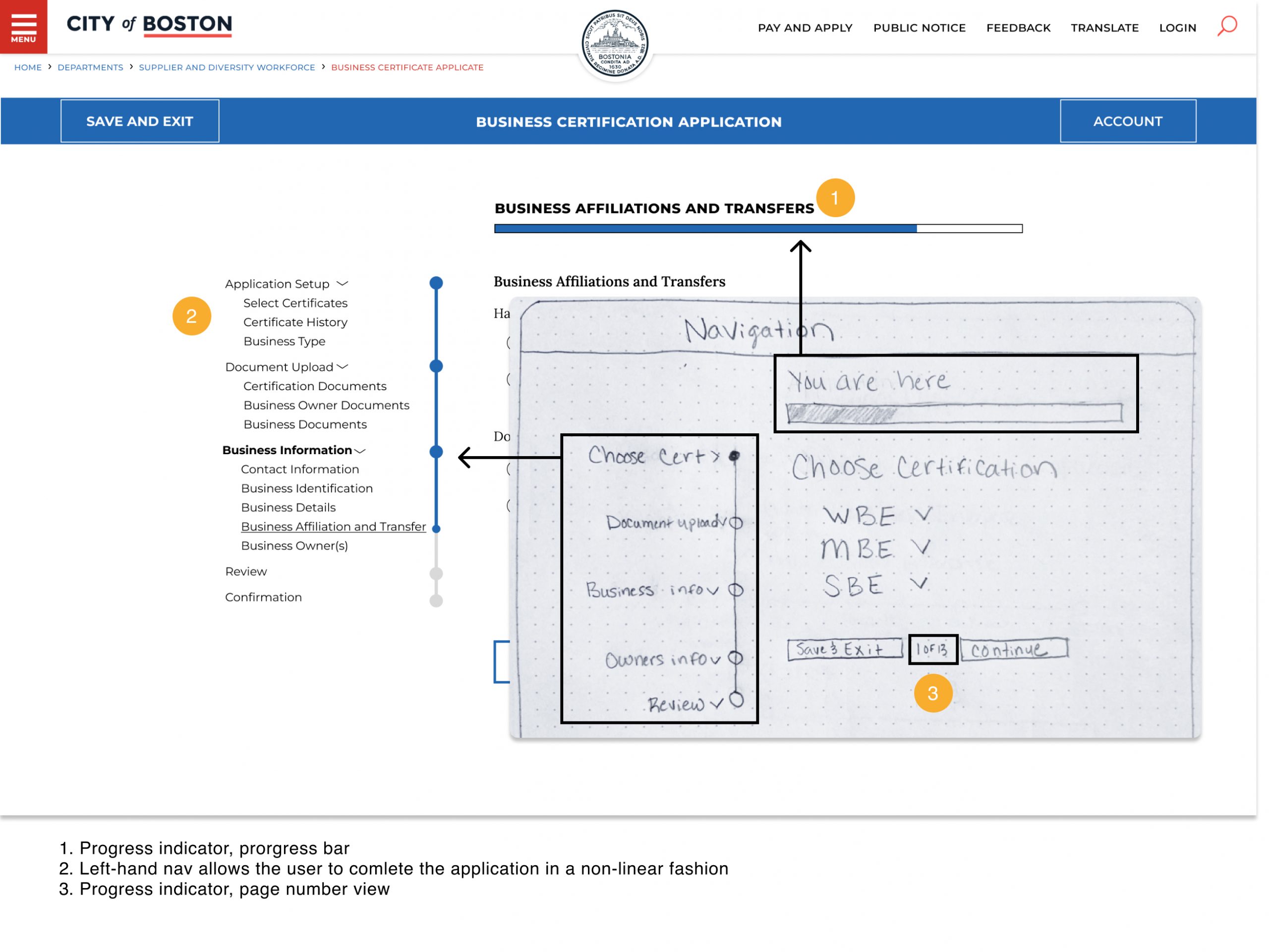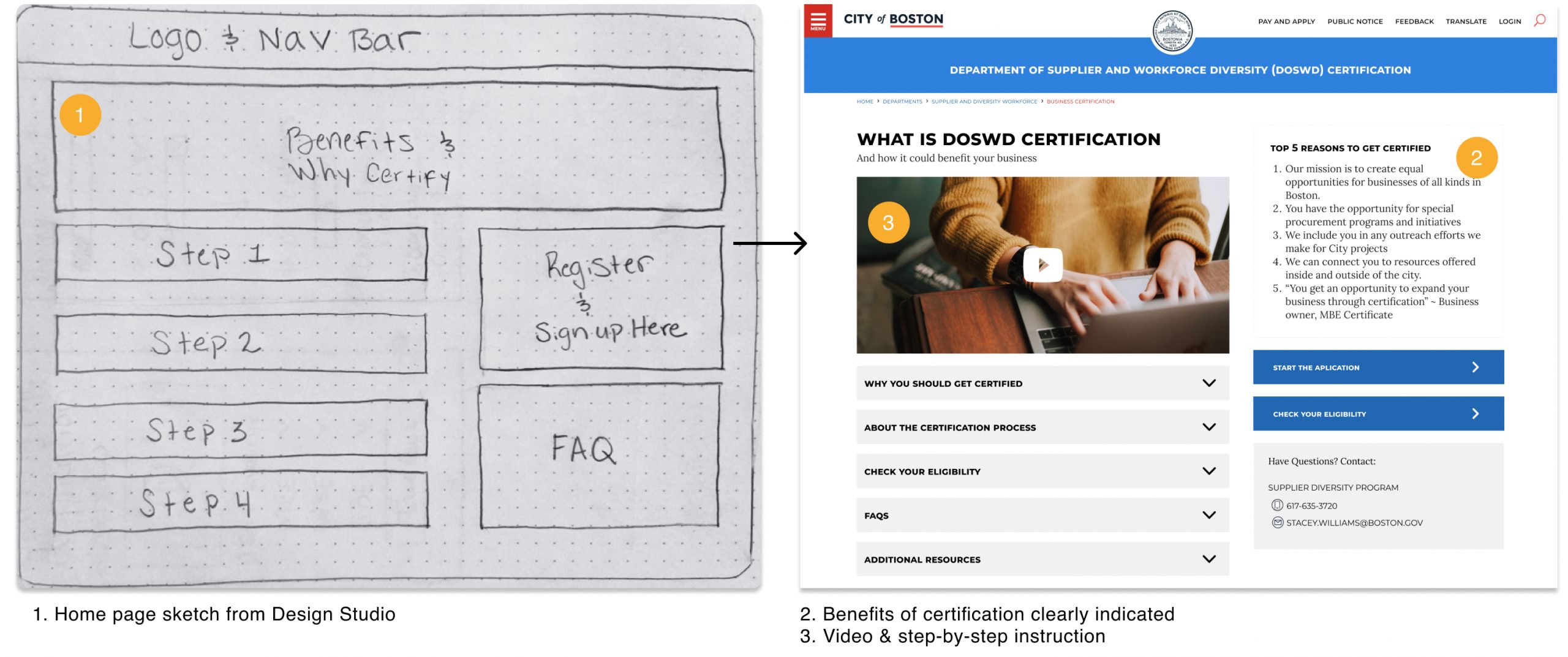Visual Design and voice was derived from the City of Boston’s brand guidelines. Based on user research, we found leaving the COB website and entering a third party site was confusing. Users were unsure whether this certification was through the DOSWD or an unidentified third party.