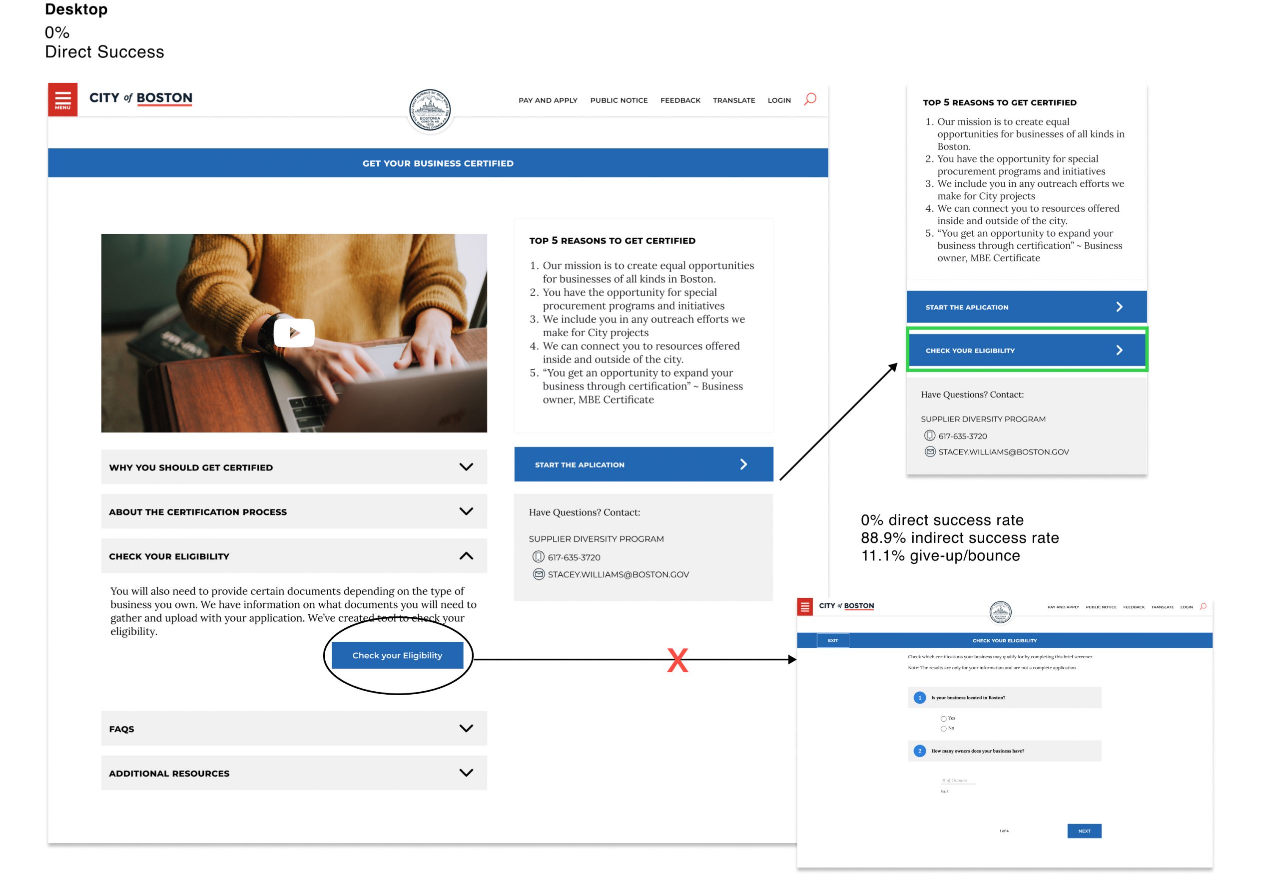 When tasked to find what certification they qualified for, users did not follow the happy path. Interestingly, when the same users tested the mobile application with the same task, they were forced to scroll through the content – and usability was much higher. After simply adding the “Check your Eligibility” button under “Start your Application” the direct success rate improved to 98%. And the bounce rate decreased over 8%.
